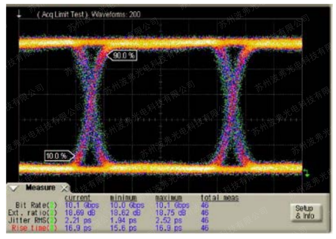 動態(tài)消光比的測量需要接入射頻RF電信號在調(diào)制器的射頻端口,并且DC偏壓設(shè)置在所做應(yīng)用的合適工作點上(通常Quad+,Quad-,Min,詳見調(diào)制器的偏壓控制文章)。所以,動態(tài)消光比是和最終應(yīng)用相關(guān)的。例如數(shù)字調(diào)制方式(10Gb/s,通過MX-LN-10調(diào)制),如下圖,通過PRBS產(chǎn)生射頻電信號,偏壓控制在Quad點上,通過高速示波器,我們測量的眼圖最高和最低水平的比值-動態(tài)消光比是18.6dB(見示波器測量數(shù)值Ext. Ratio)。