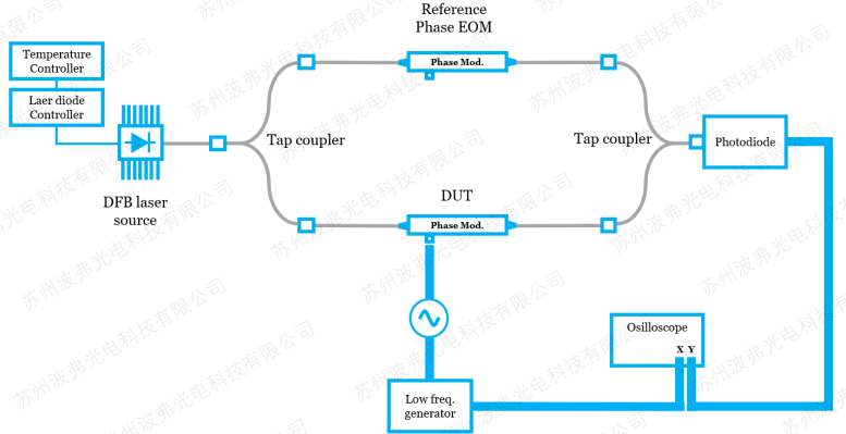 對于相位調(diào)制器測量VπRF,必須將相位的變化轉(zhuǎn)變?yōu)閺姸鹊淖兓?。這有很多方法:其一包括45度入射相位調(diào)制器波導(dǎo)(偏振波導(dǎo)APE工藝不適用,通常iXblue 1um及其以下波長調(diào)制器為偏振波導(dǎo)),建議一個干涉儀系統(tǒng)。其二可通過在一路光路中加入相位調(diào)制器,建議法布里-珀羅干涉儀。更多方法,請參考我們應(yīng)用指南”相位調(diào)制器帶寬測試”應(yīng)用指南。