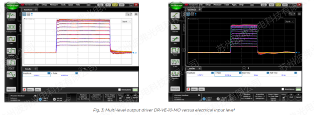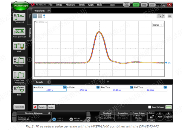 使用AWG,第一調(diào)制塊AM1用于產(chǎn)生超短光脈沖。采用iXblueNIR-MX800、MXER1300和MXER高對比度寬帶幅度調(diào)制器,分別在850nm、1310nm和1550nm處獲得70ps的超短光脈沖。調(diào)制器與驅(qū)動器DR-VE-10-MO相結(jié)合,DR-VE-10-MO可被設(shè)置為方形或高斯脈沖,限幅或線性放大器。采用iXblue偏壓控制器MBC-DG-LAB,在高達(dá)數(shù)GHz的脈沖重頻下,獲得了較高的脈沖消光比穩(wěn)定性。