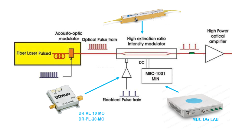 脈沖提取應用,其方案如上圖所示。以脈沖激光器產生的脈沖激光為載波,信號發生器產生電脈沖,經由射頻放大器(DR-VE系列)進行放大,加載到高消光比強度調制器(MXER-LN系列)中,經過電光轉化,電脈沖信號成功加載到載波光信號之上,從而達到脈沖提取的目的。