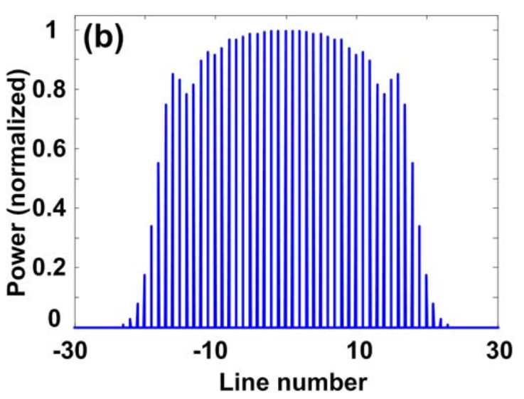 光學(xué)頻率梳(Optical Frequency Comb)是由一系列離散、等間距的規(guī)則光脈沖序列組成,能夠在一個(gè)頻段內(nèi)同時(shí)提供幾個(gè)至上百個(gè)個(gè)不同的頻率成分。具有梳線數(shù)目多、頻率范圍廣等優(yōu)勢,且具有固定的頻率間隔等,能夠代替多個(gè)激光器,是理想的多載波光源。
