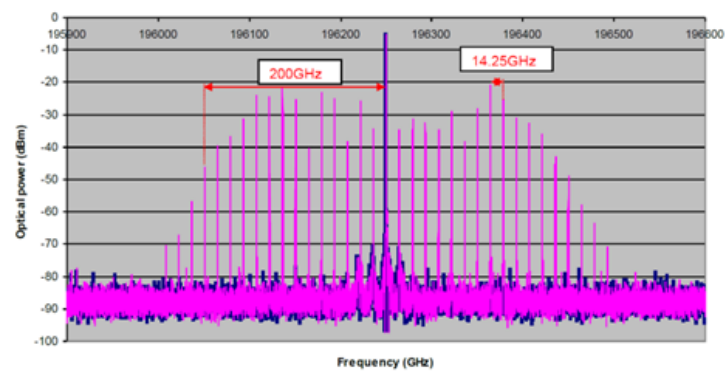 基于鈮酸鋰電光調(diào)制器所產(chǎn)生的光學(xué)頻率梳,原理是通過鈮酸鋰相位調(diào)制器(Phase Modulator),鈮酸鋰強(qiáng)度調(diào)制器(Intensity Modulator)的邊帶產(chǎn)生(參考微信公眾號:使用電光調(diào)制器實(shí)現(xiàn)邊帶調(diào)制),通過串聯(lián)鈮酸鋰相位調(diào)制器、強(qiáng)度調(diào)制器實(shí)現(xiàn)高平坦度(~2dB),多梳線光學(xué)頻率梳產(chǎn)生,最終產(chǎn)生上百個(gè)梳線的頻率梳。基于鈮酸鋰調(diào)制器產(chǎn)生的光學(xué)頻率梳具有中心頻率已于調(diào)節(jié),重復(fù)頻率可控等優(yōu)勢。