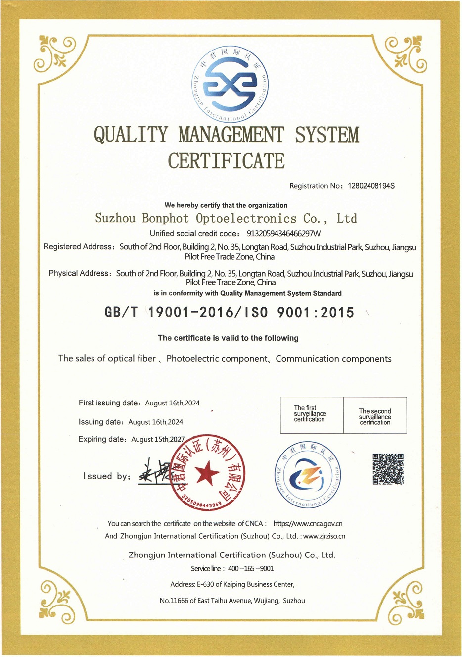 蘇州leyu集團(tuán)光電科技有限公司通過GB/T 19001-2016/ISO 9001:2015質(zhì)量管理體系認(rèn)證 證書