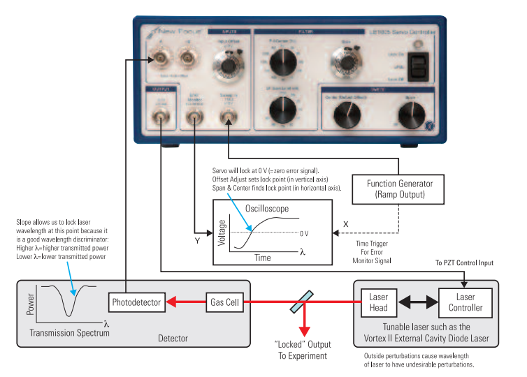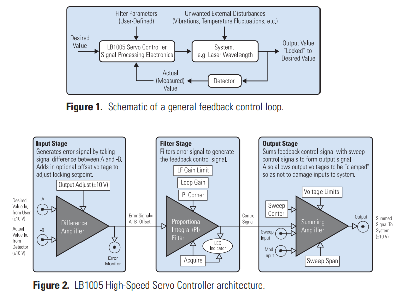 New Focus LB1005高速伺服控制器為執(zhí)行反饋控制提供了關(guān)鍵的信號處理電子設(shè)備。 在波長鎖定的情況下,誤差信號是通過將一部分激光輸出傳輸通過波長參考(例如氣室或標(biāo)準(zhǔn)具)而產(chǎn)生的。 任何波長的不穩(wěn)定性都會被轉(zhuǎn)換為可以被光電探測器檢測到的振幅電荷。 由此產(chǎn)生的誤差信號由LB1005伺服控制器過濾,形成一個控制信號,發(fā)送回激光器。 (圖1)