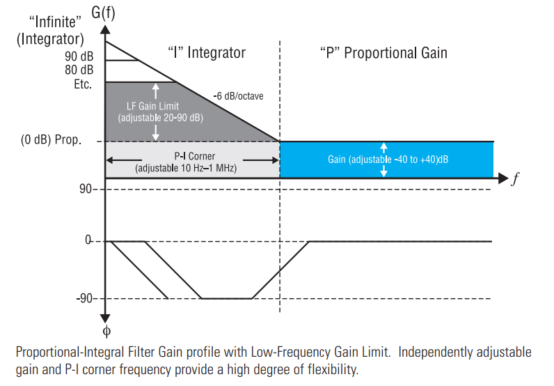 LB1005伺服控制器由模擬電子處理的三個階段組成:輸入階段、濾波器階段和輸出階段。 (圖2)過濾階段是最重要的,因為它設(shè)置系統(tǒng)的行為。 用戶控制影響系統(tǒng)穩(wěn)定性的三個重要濾波器參數(shù),以及實際輸出與所需值的匹配程度(P-I角、比例增益和低頻增益限制)。