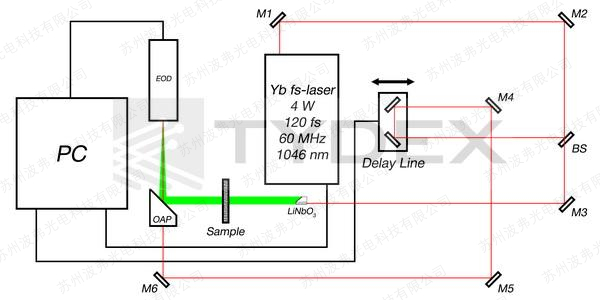 泵浦光束聚焦到生成結(jié)構(gòu)中。來自生成結(jié)構(gòu)的太赫茲輻射輸出被引導(dǎo)至包含所研究樣品的單元。 通過細(xì)胞后,太赫茲輻射被聚焦到EOD的電光晶體中。