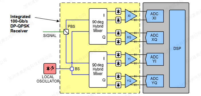 集成的100-Gb/s DP-QPSK接收器將兩個(gè)90°光混合器與四對(duì)平衡光電探測(cè)器(PD)和四個(gè)線性TIA集成到單個(gè)蝶形封裝中。 與其他不包含偏振分束器(PBS)和/或功率分束器(BS)的技術(shù)不同,Optoplex的接收器包含這兩種技術(shù)以及光混合器、PD和TIA,以提供完全集成的解決方案,這將使用戶受益 在完全消除光纖路由和傾斜管理方面。 集成接收器以高達(dá)32GBaud/s的波特率工作。