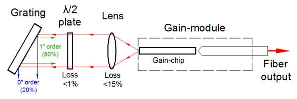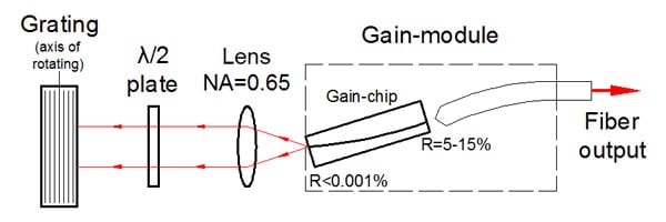 該設(shè)備包括帶有彎曲條紋的“C型”增益芯片。條紋傾斜的刻面專為外部反饋而設(shè)計,并具有深層 AR 涂層,從而使芯片波導(dǎo)的背反射極低。它確保了自激的阻斷,并消除了在外腔系統(tǒng)中操作時與復(fù)合腔相關(guān)的問題。這導(dǎo)致在整個調(diào)諧范圍內(nèi)具有高邊模抑制比 (SMSR) 的非常精細(xì)的譜線。具有垂直條紋的刻面具有適當(dāng)?shù)姆瓷渎剩ㄍǔT?5-15% 的范圍內(nèi)),以同時提供寬波長調(diào)諧和高輸出功率。標(biāo)準(zhǔn)器件中這一方面的反射針對在外腔設(shè)置中的操作進行了優(yōu)化,該設(shè)置為芯片提供了有效的反饋(約 50%)(如圖所示)。對于反饋較低的方案,我們建議使用在刻面上具有不同涂層的定制設(shè)備,以提供優(yōu)化的反射。