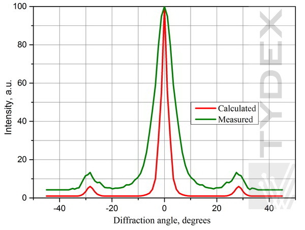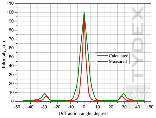 對于具有使用瑞利準則確定的特定透射帶的衍射光柵,衍射單色波強度與波長有關。它在范圍的中間達到最大值并在其邊界附近下降。例如,圖 3-6 顯示,對于間距為 250 μm(透射帶 1.56-3.12 THz,或 96-192 μm)的 TPX 和 ZEONEX 衍射光柵,λ=141 μm 單色波的一階最大值強度是其數(shù)倍大于 λ=118 μm 單色波。 (第一個在傳輸帶的中間,而第二個更靠近邊緣。)它與使用 Fraunhofer 近似計算的單個單色波的理論衍射波強度和一階極大角相匹配。由于測試光柵時使用不同的輻射源和光學布置,以下強度以任意單位給出。