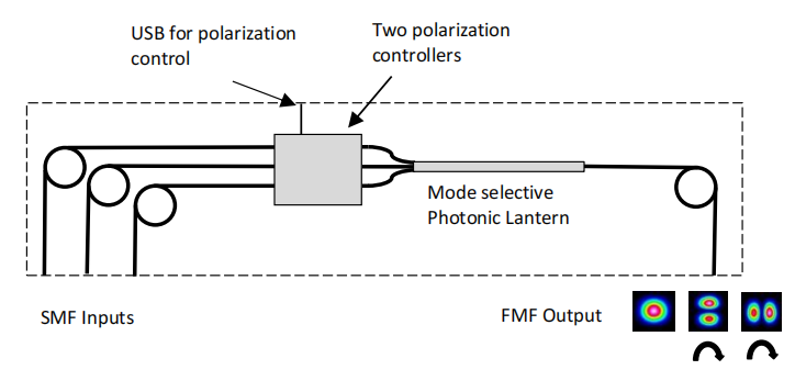 模式多路復(fù)用器和多路分解器由兩個(gè)光子燈籠組成,一個(gè)用于多路復(fù)用,另一個(gè)用于在一個(gè)(多路復(fù)用器)上進(jìn)行偏振控制的多路分解。